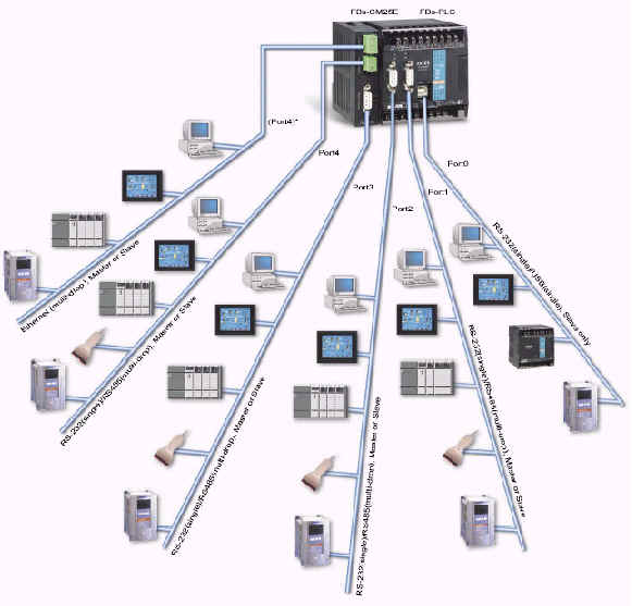 智能型外圍聯(lián)機 Bs-PLC之5個通訊端口可同時連結(jié)各種智能型外圍,界面則有USB、RS232、RS485、以太網(wǎng)絡(luò)(Ethernet)可供選擇,除可選用永宏標(biāo)準(zhǔn)通訊協(xié)議或Modbus通訊協(xié)議或透過FATEK Communication Server通訊伺服器來通訊外,尚可利用CLINK通訊便利指令,自行定義通訊協(xié)議主動或被動地與任何智能型外圍聯(lián)機。