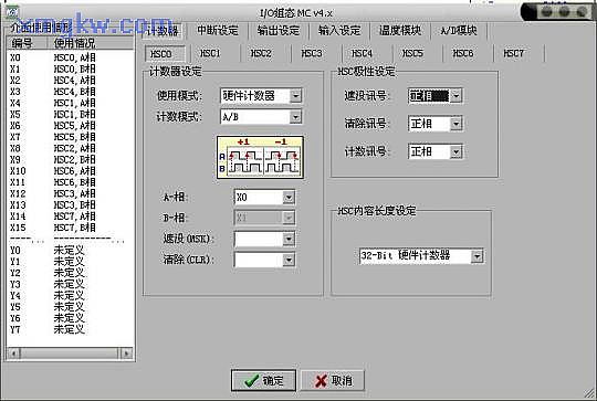 (1) 主機具備4個200kHz的硬件高速計數(shù)器(HHSC)和4個頻率總和為5kHz的軟件高速計數(shù)器(SHSC),無需另加高速計數(shù)模塊即可滿足系統(tǒng)需求。軟件高速計數(shù)器支持U/D,P/R,A/B三種計數(shù)模式,硬件高速計數(shù)器更是支持U/D*2, P/R*2, A/B*2,A/B*3, A/B*4,共計8種計數(shù)模式。