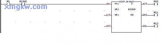 (3) 通過通訊口port1~port4的任意一個,都可以使永宏P(guān)LC作為主站,與外圍設(shè)備通過Modbus協(xié)議進(jìn)行通訊。同樣是通過“功能指令+表格”的形式,F(xiàn)UN150.M_BUS指令可輕易實現(xiàn)PLC對變頻器的通訊控制,簡單顯示如下: