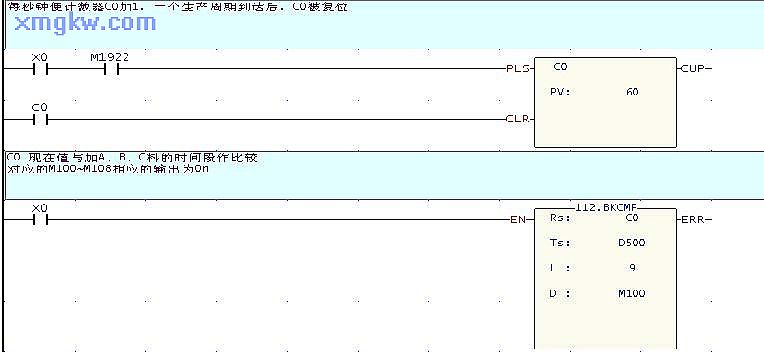 ? 所謂絕對(duì)凸輪控制,是指計(jì)數(shù)器 C現(xiàn)在值在設(shè)置的一段絕對(duì)時(shí)間段內(nèi),對(duì)應(yīng)輸出裝置會(huì) ON,多個(gè) M 裝置可能同時(shí)為 ON。本例中, C0現(xiàn)在值與 9段設(shè)置絕對(duì)時(shí)間段( D500~D517)進(jìn)行比較,在這些設(shè)置時(shí)間段內(nèi),對(duì)應(yīng)的 M100~M108 中的裝置狀態(tài)輸出為 ON。 z在BKCMP指令被執(zhí)行前,也可用 MOV指令預(yù)先將各設(shè)置值寫入到 D500~D517中。| C0當(dāng)前值所屬范圍 | 輸出裝置 |
