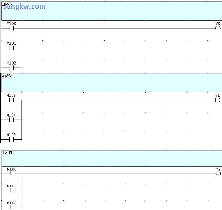 【控制要求】生產(chǎn)某種產(chǎn)品需 A、B、C三種原料, 1個(gè)生產(chǎn)周期為 60秒,這些原料需在生產(chǎn)周期適當(dāng)時(shí)間段加入。要求在生產(chǎn)周期的 10秒~20秒,30~40秒,50秒~55秒期間加入 A原料;在生產(chǎn)周期的 0秒~10秒,20~25秒, 40秒~50秒期間加入 B原料;在生產(chǎn)周期的 20秒~25秒,30~35秒,40秒~45秒期間加入 C原料。