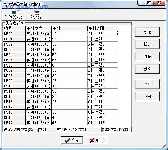【控制程序】首先將各種原料加入的下限、上限時(shí)間設(shè)定在緩存器表格中,如下圖: