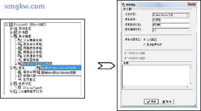 【ModBus Master表格的編輯】方法1:點(diǎn)選菜單欄的“專案” ?“ModBus Master表格” ?“新增ModBus Master表格”。方法2:在專案管理窗口,展開“表格編輯”,右鍵單擊“ ModBus Master表格” ?“增加 ModBus Master表格”,如下圖所示。方法3:鼠標(biāo)左鍵單擊梯形圖中的 FUN150指令,按鍵盤“ Z”,彈出“表格編輯”對(duì)話框 。
