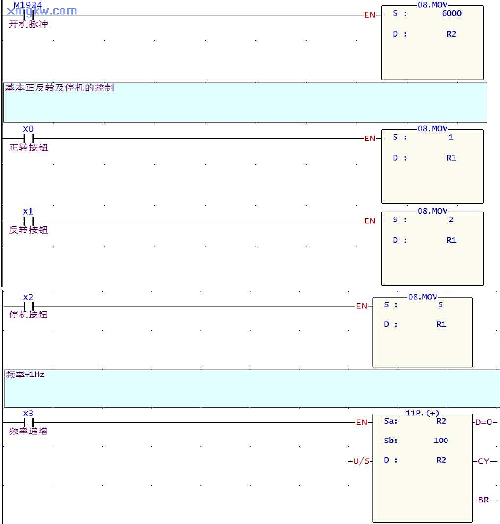 z設(shè)置變頻器主頻率為 60Hz正方向啟動(dòng)。z讀取英威騰 CHE100系列變頻器運(yùn)行頻率和設(shè)定頻率,并將其分別存于 D0、D1中。z遠(yuǎn)程手動(dòng)微調(diào)頻率,以 1Hz為單位。
