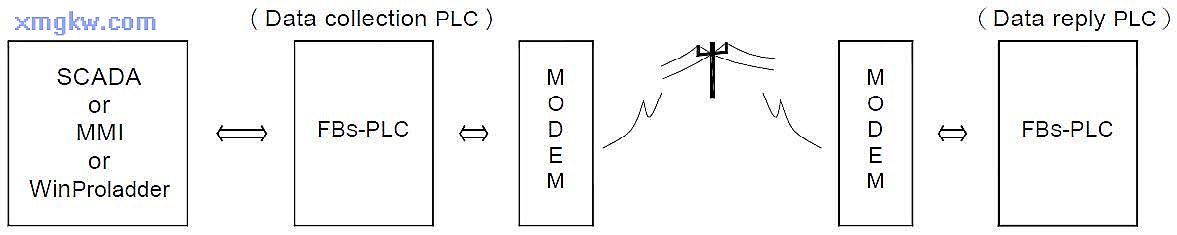 PLC 可經(jīng)由通訊端口 1 接MODEM通過電信網(wǎng)絡(luò)與遠程的 PLC 聯(lián)機共享數(shù)據(jù),應(yīng)用如下: