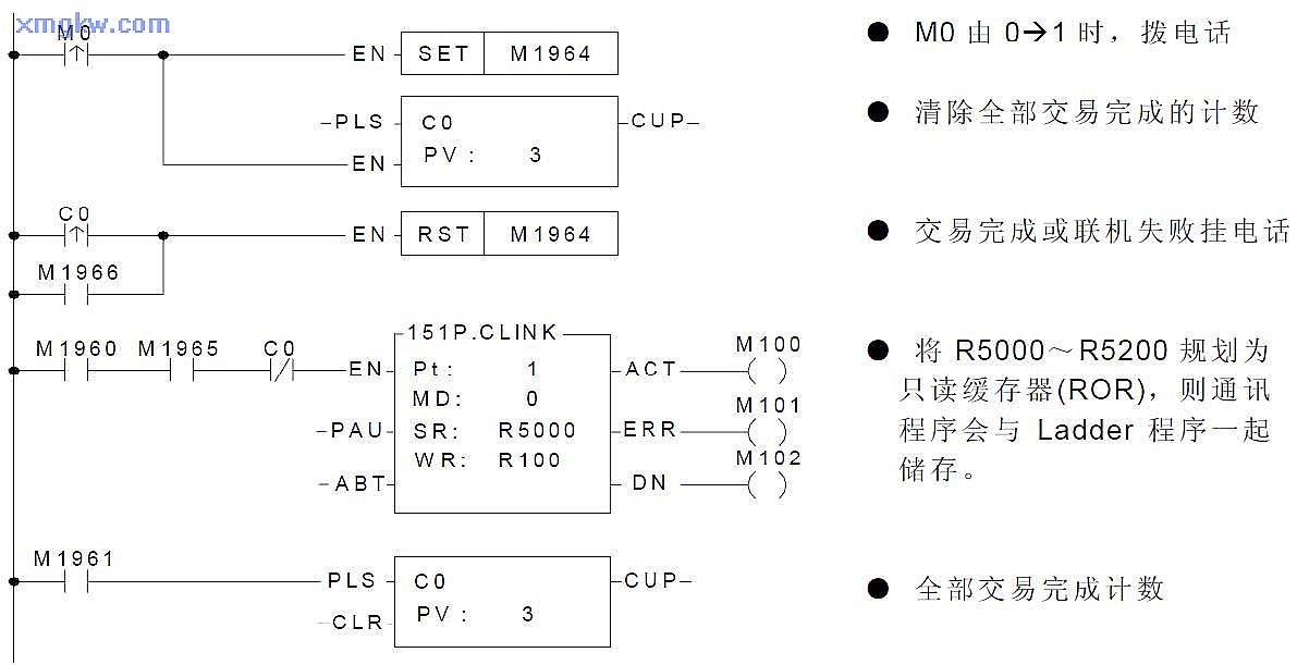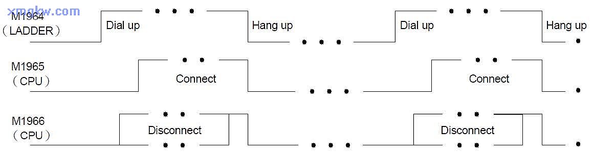 【MODEM 撥號接口信號】 M1959:OFF,撥號方式為〝 Tone〞;ON,撥號方式為〝 Pulse〞。 M1964:OFF→ON,撥號。 ON→OFF,掛電話。R4163:R4163的低字節(jié) (Low Byte)用來控制 MODEM撥號時 X指令的應(yīng)用