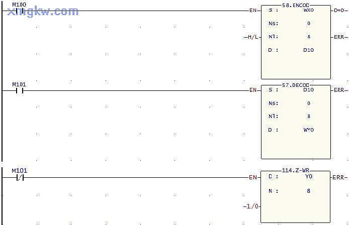 M101= ON,執(zhí)行 DECOD指令,設(shè)置 D10的值, D10的值會(huì)被譯碼到 Y0~Y7中之一,從而使對(duì)應(yīng)的輔助流水線(xiàn)暫停,例如, D0=5,則譯碼得到 Y5=ON,編號(hào) 5的輔助流水線(xiàn)將暫停運(yùn)行;當(dāng) M101=OFF, Z-WR指令執(zhí)行, Y0~Y7都為OFF,所有的流水線(xiàn)都正常運(yùn)行。