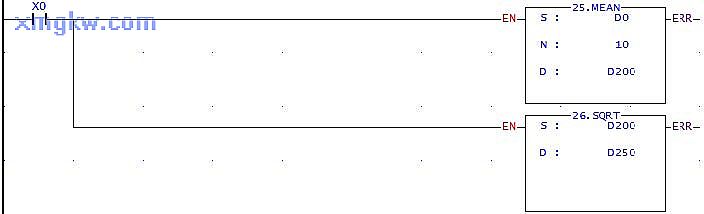 1.當(dāng) X0 =ON時(shí),將 D0~D9等10筆歷史數(shù)據(jù)平均值存于 D200,D200開(kāi)平方后存于 D250。