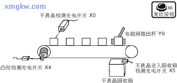 【控制要求】產(chǎn)品被傳送至傳送帶上作檢測,當(dāng)光電開關(guān)檢測到有不良品時(高度偏高),在第 5個定點將不良品通過電磁閥排出,排出到回收箱后電磁閥自動復(fù)位。當(dāng)在傳送帶上的不良品記憶錯亂時,可按下復(fù)位按鈕將記憶數(shù)據(jù)清零,系統(tǒng)重新開始該檢測。