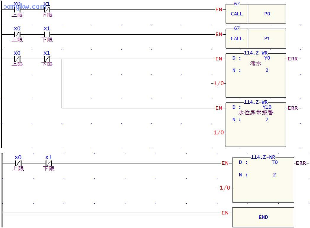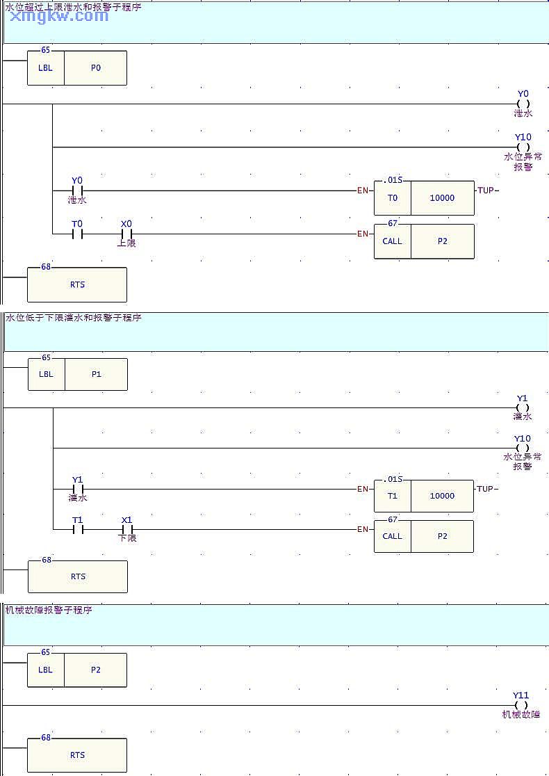 P0和P1子程序中嵌套了 CALL P2子程序,如果進行泄水動作 100秒,但水位上限傳感器仍為 ON,則執(zhí)行P2子程序, Y11線圈導通,機械故障指示燈報警。