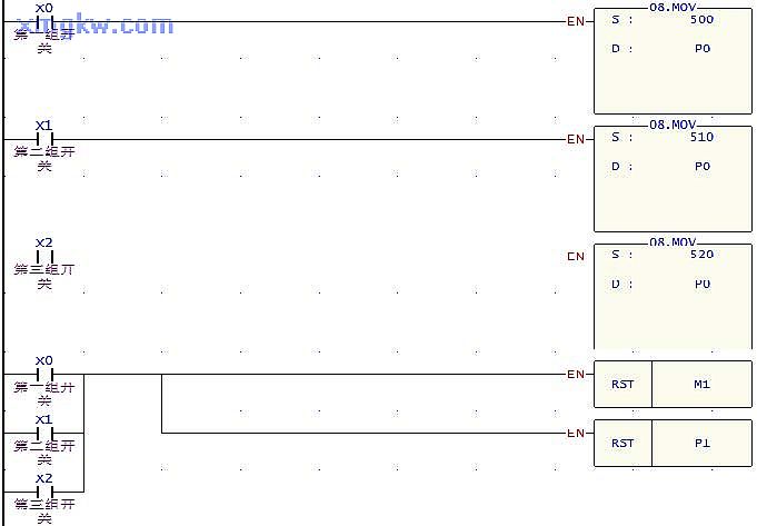 當(dāng)選擇其中一組配方參數(shù)時, X0、X1、X2其中一個將變?yōu)?ON,P0的值將分別對應(yīng)為 500、510、520, DP0將分別代表 D500、D510、D520,同時 [RST M1]指令執(zhí)行, M1復(fù)位變?yōu)镺FF,RST P1指令和 FOR~NEXT循環(huán)將被執(zhí)行,因 P1被復(fù)位變?yōu)?0,DP1代表D0。
