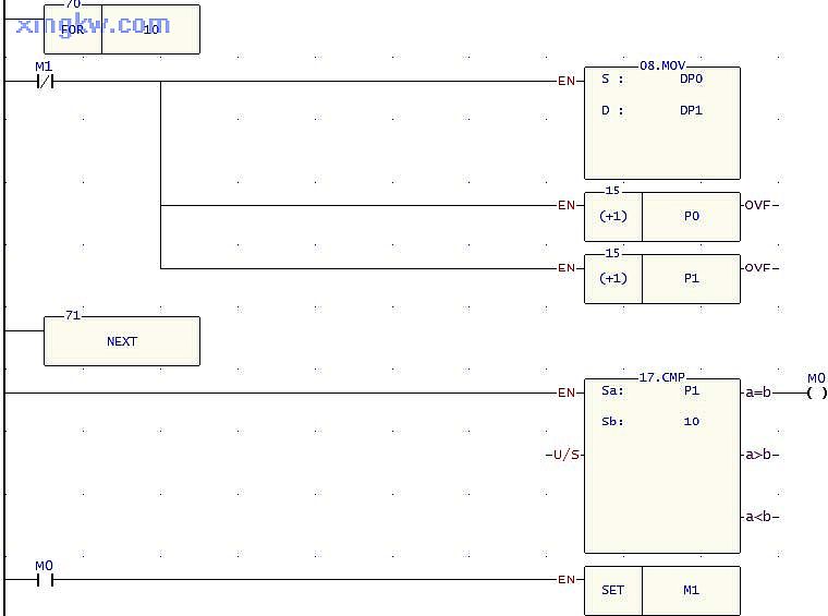 當(dāng)循環(huán)次數(shù)到達時,即 P1=10,[SET M1]指令將被執(zhí)行, M1被置位變?yōu)?ON,F(xiàn)OR~NEXT循環(huán)中的指令因M1的常閉接點斷開而停止執(zhí)行。