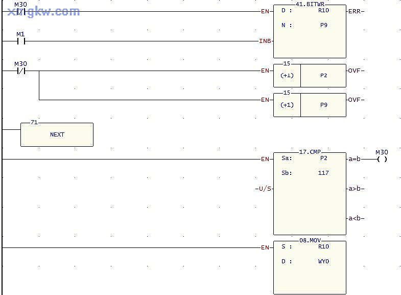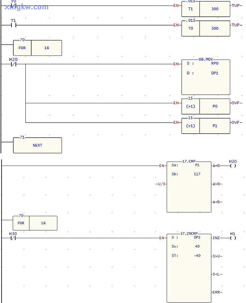 【控制要求】 FBS-40MA + FBs-TC16,偵測外部 16路溫度 , 每隔3秒將新溫度數(shù)據(jù)放入 D101-D116;當(dāng)溫度超過 40℃或小于- 40℃時(shí),正常指示燈滅。