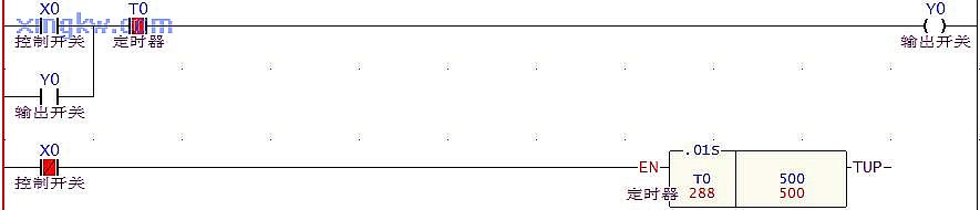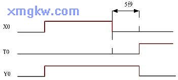 當(dāng)開關(guān) X0接通為 ON時(shí)燈 Y0亮,當(dāng)開關(guān) X0斷開為 OFF時(shí),需再經(jīng)過 5秒鐘后 Y0燈才熄滅?!窘M件說明】