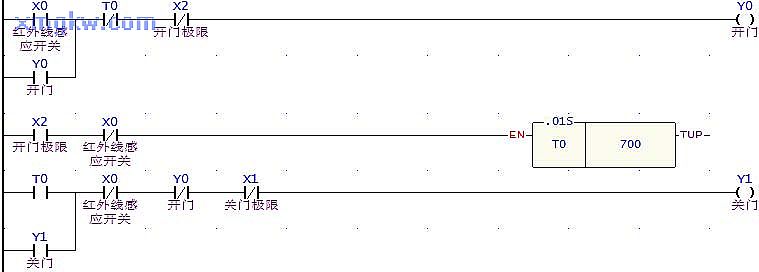 只要人進(jìn)入紅外線傳感器區(qū)域, X0=ON,此時(shí)只要門未在開(kāi)門極限開(kāi)關(guān)處( X2=OFF),Y0=ON并自保,都會(huì)執(zhí)行開(kāi)門的動(dòng)作。