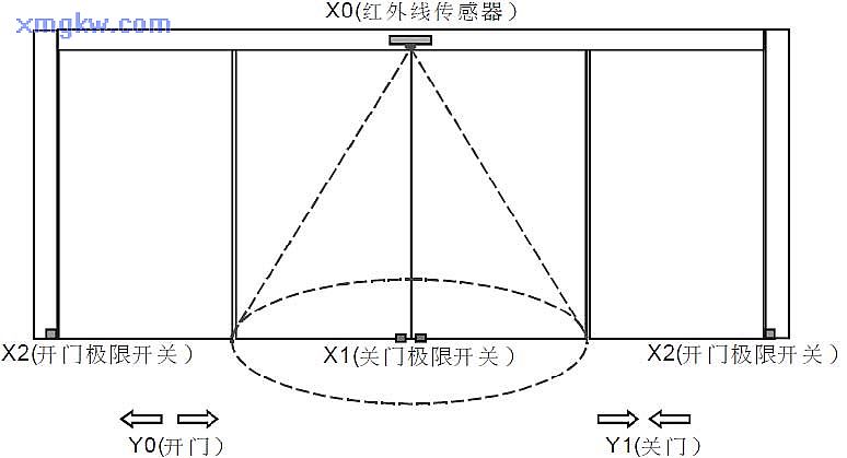 當(dāng)人進(jìn)入紅外線傳感器區(qū)域時(shí),開(kāi)門電機(jī)啟動(dòng),門自動(dòng)打開(kāi),直到碰到開(kāi)門極限停止。