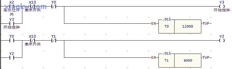 碰到低水位浮標(biāo)傳感器后, X2=ON,Y3=ON,攪拌電機(jī)開始工作,同時(shí)定時(shí)器 T0開始計(jì)時(shí), 120秒后,T0=ON,Y3被關(guān)斷,攪拌電機(jī)停止工作, Y2=ON并自保,混合液體開始流出。