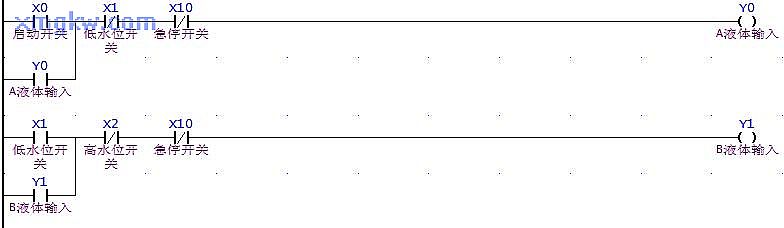 碰到低水位浮標(biāo)傳感器后, X1由 OFF→ON動(dòng)作, Y1=ON并自保持,直到碰到高水位浮標(biāo)傳感器后停止液體 B注入。