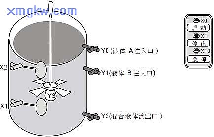 X0=ON,Y0=ON 并自保,閥門打開注入液體 A,直到碰到低水位浮標(biāo)傳感器后停止液體 A 注入。