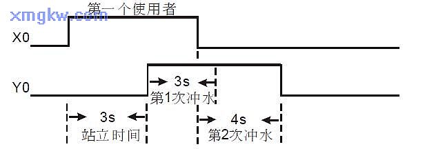 當檢測到有人進入時,紅外線傳感器 X0=ON,T0得電開始計時。若在 3秒內(nèi)人離開( X0=OFF), T0失電,不執(zhí)行任何動作。若人站滿 3秒,則 T0的常開接點閉合,保持 M0=ON,開始第一次沖水(Y0=ON)。