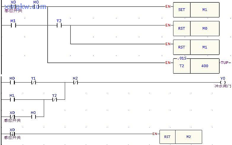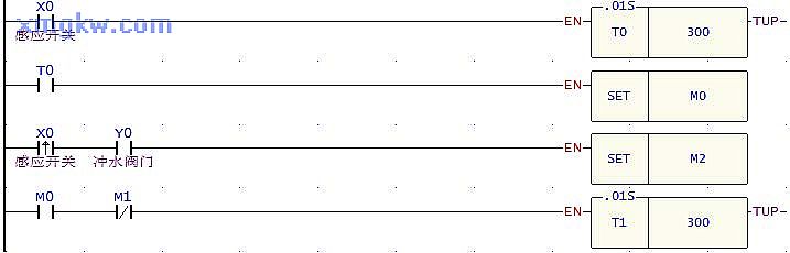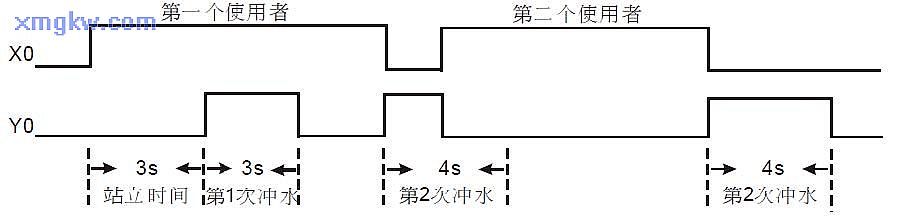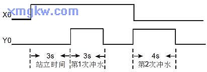 M1形成了一個自保電路。當使用者站立時間超過 3秒才離開(常開接點 M0=ON、常閉接點 X0=ON)時, M1保持為 ON。開始第二次沖水( Y0=ON),直到?jīng)_水 4秒后( T2的常開接點閉合,常閉接點斷開),停止沖水( Y0=OFF),M0、M1被復(fù)位。