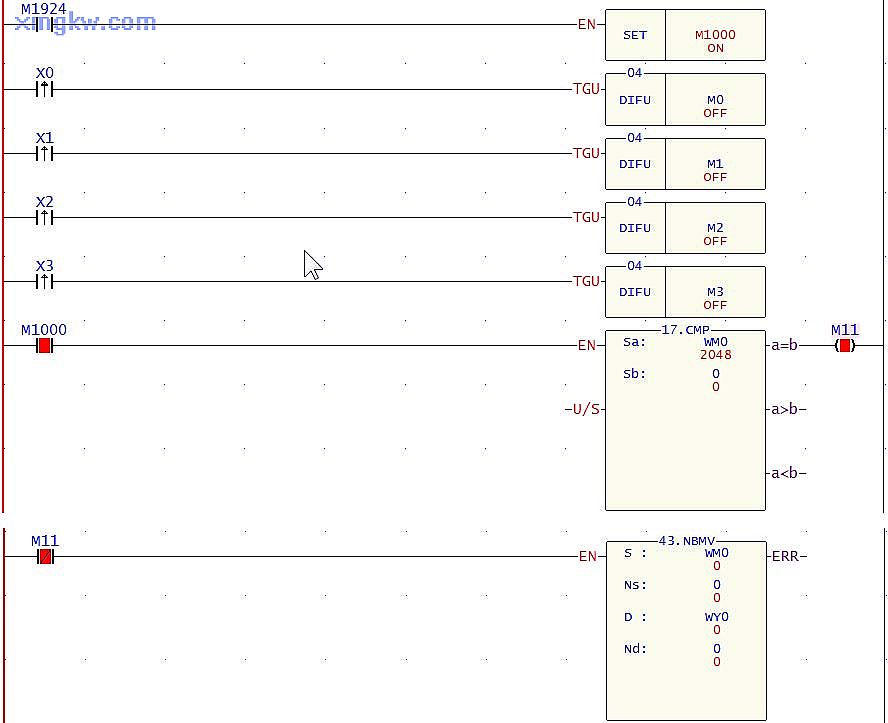 - 按下任何按鈕后,對(duì)應(yīng)的 X輸入信號(hào)點(diǎn)將由 OFF→ON變化一次,在這個(gè)掃描周期里, DIFU指令被執(zhí)行,對(duì)應(yīng)的一個(gè) M輔助繼電器接通一個(gè)掃描周期,則 WM0>0,CMP指令執(zhí)行后的結(jié)果使得 M11=OFF, M11的常閉觸點(diǎn)導(dǎo)通, [NBMV]指令被執(zhí)行, M 裝置的狀態(tài)將被傳送到外部相應(yīng)的一個(gè)輸出點(diǎn)上,同時(shí)原來(lái)點(diǎn)亮狀態(tài)的指示燈將熄滅。