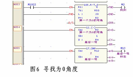系統(tǒng)的每一個零件最多可設定20個彎管角度和20個空間旋轉(zhuǎn)角度。由于每種零件的彎管角度不可能全部設定,當一種零件的彎管角度個數(shù)少于20個(即其它角 度均為0),CPU將繼續(xù)進行掃描,直至20角度全部執(zhí)行完畢,這在很大程度上不僅浪費了CPU的掃描時間,也降低了系統(tǒng)工作效率。因此,在設計過程中, 采用為0參數(shù)尋找方式,程序設計如圖6所示,當20個參數(shù)暫存器中第N個為0時,M2=ON,此時R4的資料為第N個參數(shù)暫存器,并告知CPU執(zhí)行到時結(jié) 束執(zhí)行彎管命令。