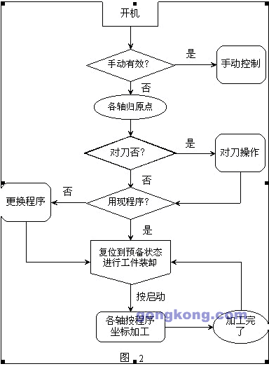 即利用各手動(dòng)控制開關(guān)執(zhí)行手動(dòng)操作的項(xiàng)目。若手動(dòng)開關(guān)無效,則啟動(dòng)原點(diǎn)復(fù)歸程序,各軸進(jìn)行機(jī)床原點(diǎn)復(fù)歸,先回Z軸再回其它兩軸,當(dāng)所有軸都原點(diǎn)復(fù)歸成功后 才能進(jìn)行到下一步。若刀具和工裝夾具、工件程序均沒有變動(dòng),可復(fù)位到加工預(yù)備狀態(tài)而不進(jìn)行對(duì)刀,若需對(duì)刀,則打開對(duì)刀開關(guān)啟動(dòng)對(duì)刀程序,3軸分別對(duì)刀,即 找工件原點(diǎn),利用手動(dòng)各軸移動(dòng)開關(guān)快慢移動(dòng)各軸,使工件的三個(gè)面分別碰觸低速旋轉(zhuǎn)的刀具,剛好碰上為止。對(duì)好后,按對(duì)刀OK確認(rèn),再輸入刀補(bǔ),經(jīng)過程序處 理,即形成工件原點(diǎn)也就是編程0點(diǎn),編程時(shí)根據(jù)此0點(diǎn)按照?qǐng)D紙計(jì)算刀具路徑,可使操作者思路清晰,編輯運(yùn)算簡(jiǎn)單。操作者編輯的是用戶程序,可以編輯刀具軌 跡,就是各軸移動(dòng)坐標(biāo),還有移動(dòng)速度、循環(huán)加工時(shí)的循環(huán)次數(shù)等。編好程序后或使用當(dāng)前程序時(shí),即復(fù)位到預(yù)備狀態(tài):各軸移動(dòng)到初始位—一個(gè)合適的位置,裝卸 工件方便、不易碰觸刀具時(shí),裝上工件,按啟動(dòng)即可開始加工,主軸運(yùn)轉(zhuǎn),冷卻液開,各軸按程序設(shè)定坐標(biāo)移動(dòng)。當(dāng)加工結(jié)束時(shí),機(jī)床復(fù)位,即各軸又移動(dòng)到初始 位,主軸停,冷卻關(guān),這時(shí)可卸下工件,完成加工過程。