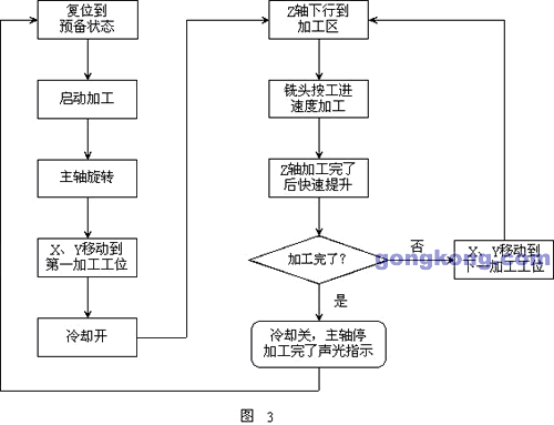 就有30個(gè)φ3.7的平底盲孔需要加工,刀具選用φ3.7的2刃鎢鋼立銑刀,鉆削加工,鉆削深度1.65mm。在預(yù)備狀態(tài)時(shí)緊靠工作臺(tái)上的定位固定好胎 具,按啟動(dòng)后,主軸旋轉(zhuǎn),待主軸即將達(dá)到額定轉(zhuǎn)速時(shí),X、Y軸同時(shí)運(yùn)轉(zhuǎn)到第一加工工位,也就是第一個(gè)孔的X、Y工件坐標(biāo)值,此時(shí)冷卻液打開、Z軸快速下降 到加工區(qū),即銑刀端面即將觸及工件加工面,迅速變用緩慢的工進(jìn)速度開始鉆削加工。當(dāng)加工深度到達(dá)設(shè)定深度(1.65mm)時(shí),Z軸帶動(dòng)銑刀迅速抬起,抬起 的高度為銑刀端面水平方向上碰觸不到工件及胎具為準(zhǔn)。計(jì)數(shù)器加1后程序進(jìn)行比較運(yùn)算,判斷加工是否完了,如否,則X、Y軸繼續(xù)運(yùn)轉(zhuǎn)到下一加工工位,再重復(fù) Z軸下降加工動(dòng)作。如加工完了,產(chǎn)量計(jì)數(shù)器加數(shù)、主軸停轉(zhuǎn)、冷卻液關(guān)閉,同時(shí)發(fā)出5s聲光報(bào)訊,用以提醒操作者,各軸移動(dòng)到初始位:Z軸到上端;X軸到左 端;Y軸到外端。卸下胎具后,一個(gè)加工周期完成,裝上胎具再按啟動(dòng)即開始進(jìn)行下一輪加工。